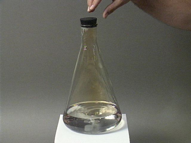 Reaction of Nitrogen Monoxide with Oxygen to form Nitric Acid Still Images A flask containing dissolved bromphenol blue indicator is filled with nitrogen monoxide, a colorless gas. When the stopper is loosened, air diffuses into the flask and oxygen reacts with the nitrogen monoxide to form nitrogen dioxide, a brown gas. The nitrogen dioxide dissolves in the solution, creating a partial vacuum within the flask. The resulting pressure difference draws more oxygen into the flask when the stopper is loosened, forming more NO2. Upon dissolving, the nitrogen dioxide reacts with water to form nitric acid, as indicated by the color change of the solution. As more brown nitrogen dioxide forms, more of the gas dissolves, increasing the acidity of the solution. You can get at large JPEG versions of the images by means of the following links. 0 1 2 3 4 5 6 7 Back to the topic