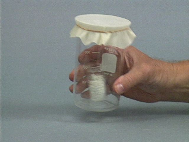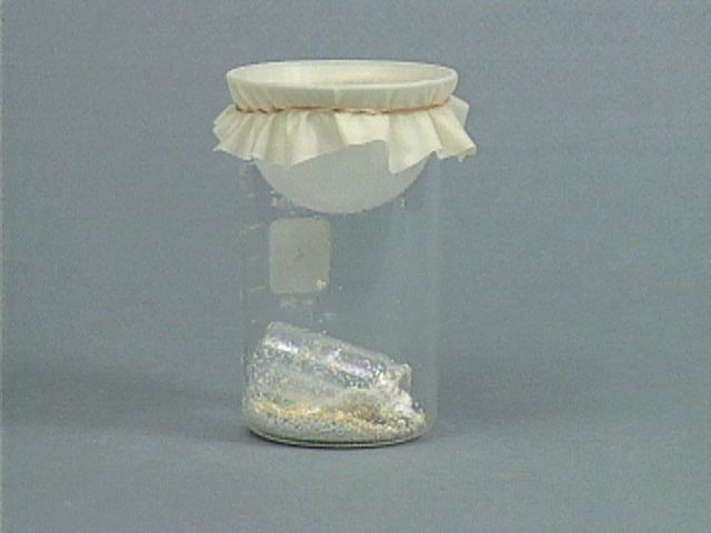 A large beaker contains a covered vial of soda lime, which is a damp mixture of sodium hydroxide and calcium oxide. Sulfur dioxide gas is added to the beaker and the top of the beaker is sealed with a rubber dam. The vial is tipped over, so the soda lime can mix with the sulfur dioxide. The reaction of the calcium oxide with sulfur dioxide creates solid calcium sulfite, decreasing the number of gas particles and thus the pressure within the beaker, so the dam is pushed inward by atmospheric pressure.