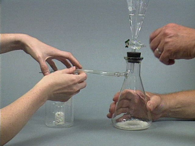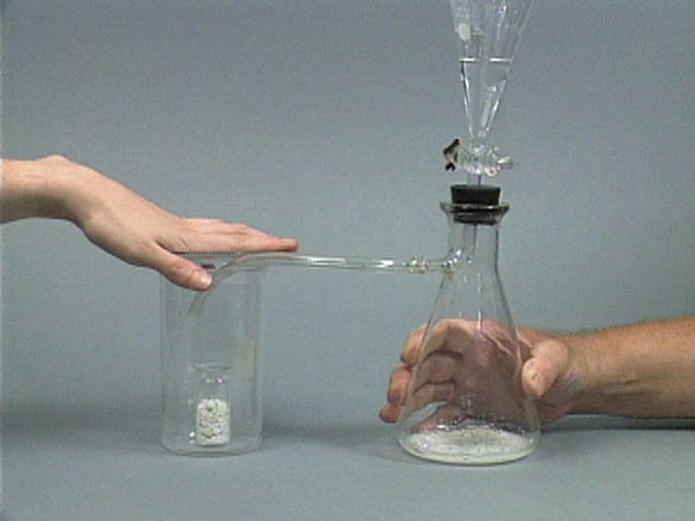 Soda Lime and Sulfur Dioxide Still Images A large beaker contains a covered vial of soda lime, which is a damp mixture of sodium hydroxide and calcium oxide. Sulfur dioxide gas is added to the beaker and the top of the beaker is sealed with a rubber dam. The vial is tipped over, so the soda lime can mix with the sulfur dioxide. The reaction of the calcium oxide with sulfur dioxide creates solid calcium sulfite, decreasing the number of gas particles and thus the pressure within the beaker, so the dam is pushed inward by atmospheric pressure. You can get at large JPEG versions of the images by means of the following links. 0 1 2 3 4 5 6 7 8 9 10 11 12 13 14 15 16 17 18 19 20 21 22 Back to the topic
