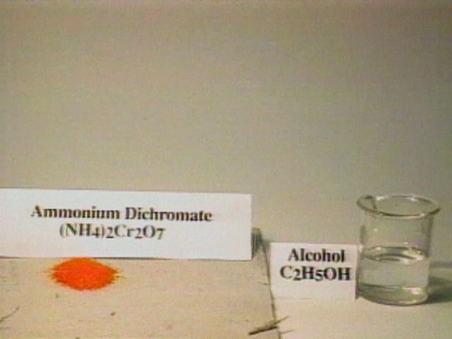 Ammonium Dichromate Volcano Still Images The ammonium dichromate volcano illustrates what happens in a chemical reaction. The orange solid is ammonium dichromate. When a wick soaked in alcohol is placed into the ammonium dichromate and ignited with a match the higher temperature causes the ammonium dichromate to start reacting. The darker material which is forming is evidence of a chemical change. As the reaction proceeds it generates heat and the dark solid material is formed more rapidly. Flames and sparks can be seen shooting upward. The orange solid has been transformed into a dark gray-green solid and the temperature has changed. These observations are characteristic of a chemical reaction: a substance with one set of properties is transformed into one or more new substances with a temperature change. You can get at large JPEG versions of the images by means of the following links. 0 1 2 3 4 5 6 7 8 9 10 11 Back to the topic