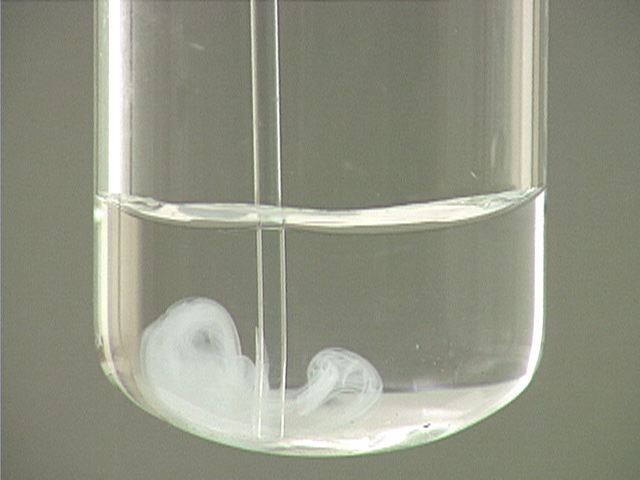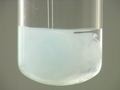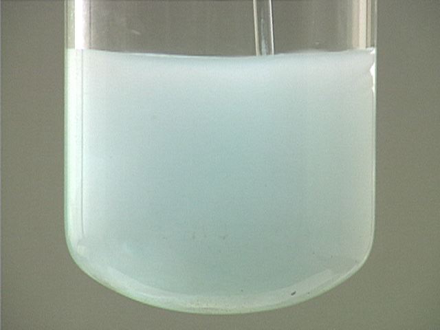 Here, copper(II) sulfate (CuSO4) is added to barium chloride (BaCl2). The result is a pale blue solution and white precipitate. The blue color is due to Cu2+(aq).