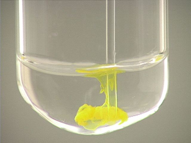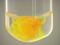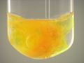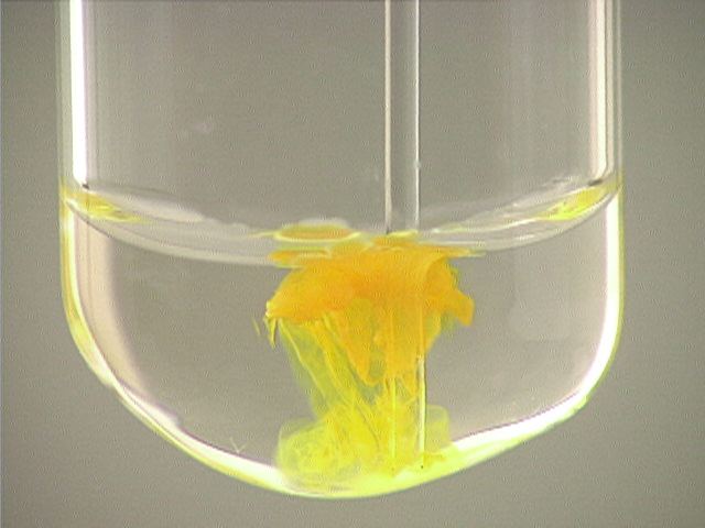 Here, sodium sulfide (Na2S) is added to cadmium nitrate (Cd(NO3)2). The result is a deep yellow-orange precipitate.