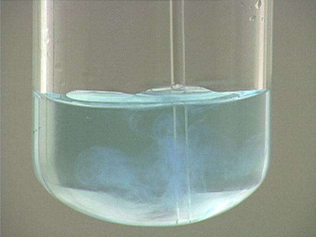 Here, ammonia (NH3) is added to copper(II) nitrate (Cu(NO3)2). The result is a pale blue precipitate, which is Cu(OH)2(s). The dark blue color is due to Cu(NH3)4 2+ .