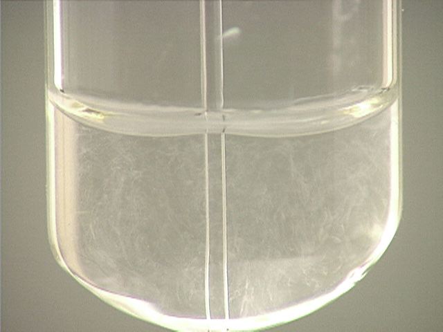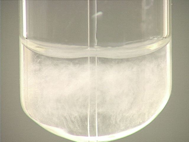 Here, sodium bromide (NaBr) is added to mercury(II) ion (Hg2+). The result is a white precipitate after a delay.