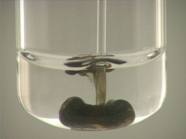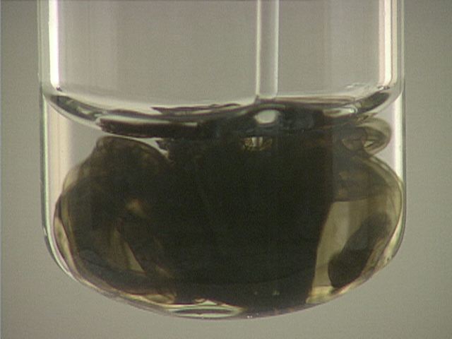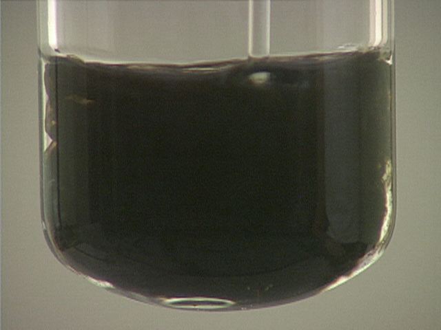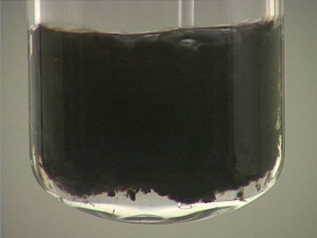 Here, sodium sulfide (Na2S) is added to mercury(I) nitrate (Hg2(NO3)2). The result is a black precipitate.