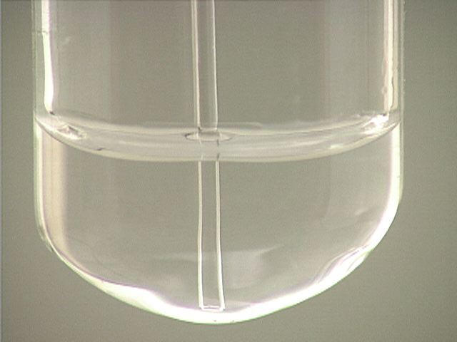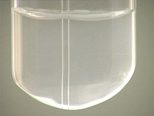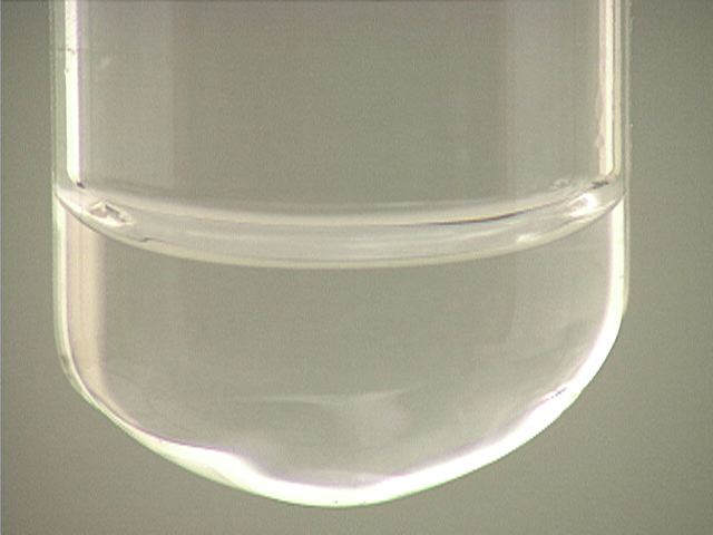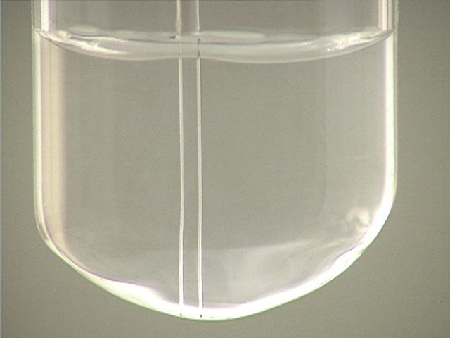 Here, sodium chloride (NaCl) is added to mercury(I) nitrate (Hg2(NO3)2). The result is a small amount of precipitate.