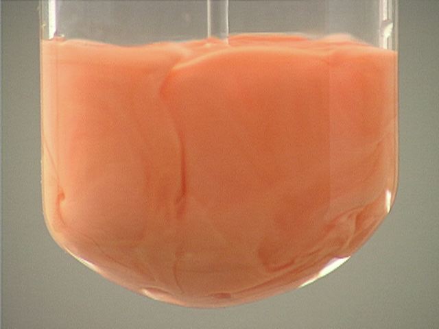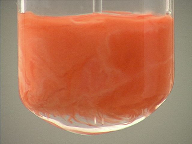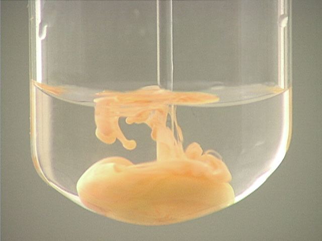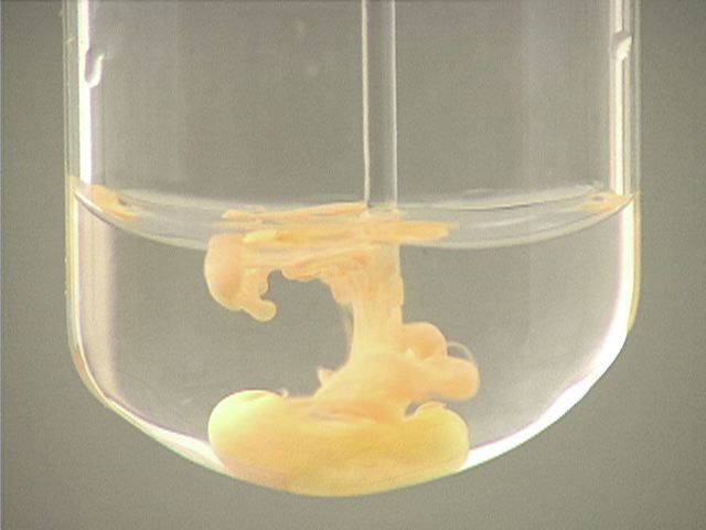 Here, sodium iodide (NaI) is added to mercury(I) nitrate (Hg2(NO3)2). The result is an orange precipitate.