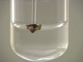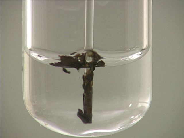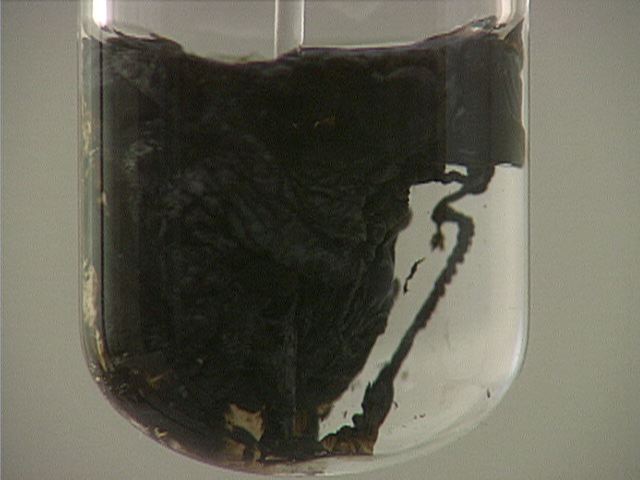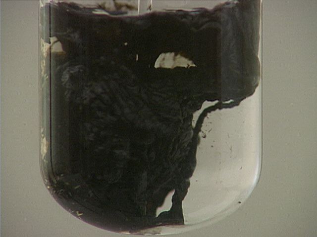 Here, sodium sulfide (Na2S) is added to lead(II) nitrate (Pb(NO3)2). The result is a thick black precipitate.