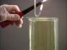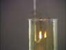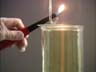 Natural gas flowing from a capillary is ignited. The watch glass covering a glass cylinder of chlorine is removed and the methane flame lowered. The reaction between methane and air is replaced by the reaction between methane and chlorine, which produces carbon, hydrogen chloride and various chlorocarbons. As the flame burns the level of chlorine gas in the container decreases. When a stopper from a bottle of aqueous ammonia is brought near the flame, white fumes of ammonium chloride are produced indicating the presence of hydrogen chloride.