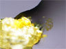 A crystal of potassium iodide (KI) is placed on a slide containing a drop of a 1.0M solution of lead(II) nitrate, Pb(NO3)2. The crystal is pushed into the solution with a small stylus. The reaction forms the bright yellow precipitate lead(II) iodide, PbI2. The reaction was filmed with a magnification of 30X.