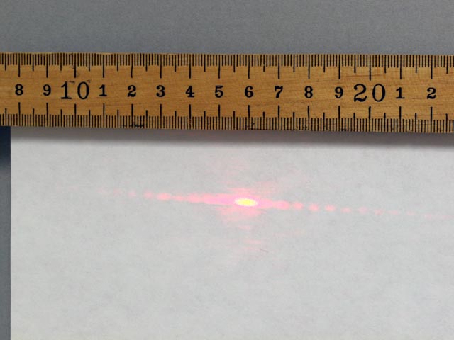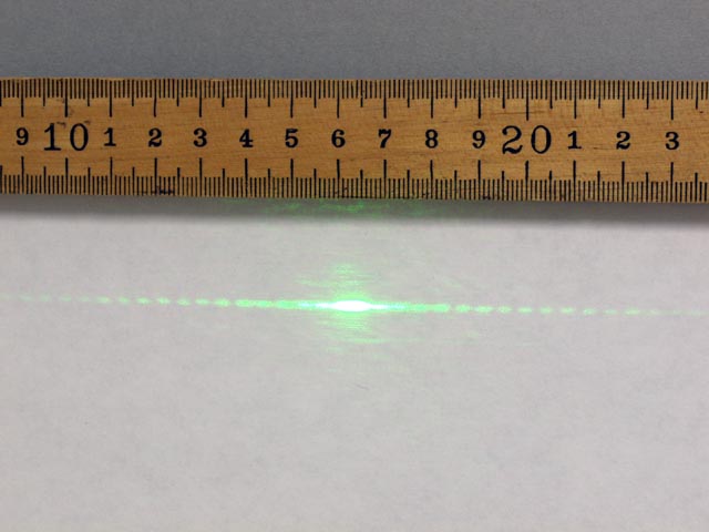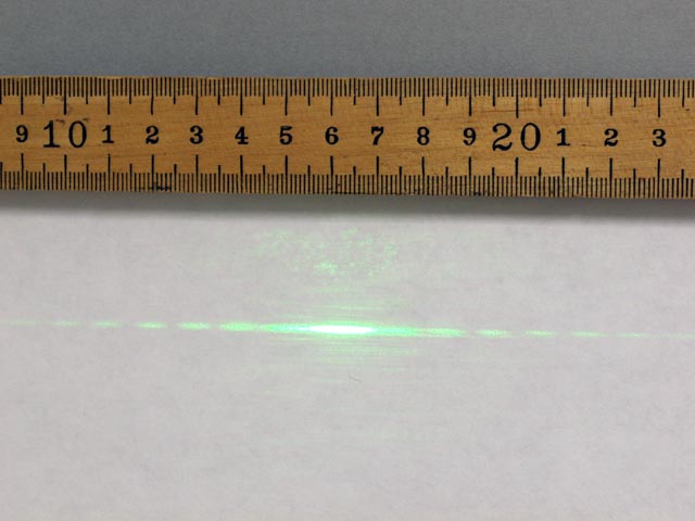 The diffraction patterns of red and green light passing through a 0.16 mm single slit (pattern C on the diffraction plate) are shown. | |