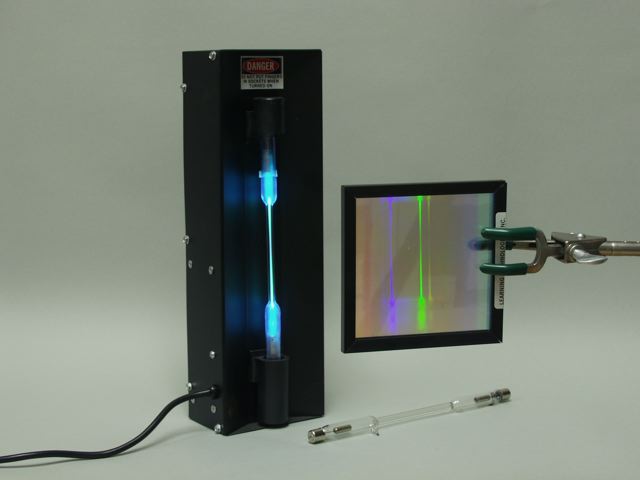 Two kinds of light sources are in common use, the incandescent bulb and the fluorescent light, the latter a modified mercury discharge lamp. Discussion In an incandescent bulb an electrical current passing through a tungsten filament heats it so that it glows white-hot. As you can see in the photo on the left, the spectrum of light from an incandescent light bulb is continuous. A mercury discharge lamp, such as that shown in the photo on the right, consists of an evacuated tube that contains a minute amount of mercury vapor and has an electrode at each end. When a high voltage, such as that produced by the power supply shown, is applied across the discharge lamp, electrons are ejected from the negative electrode, or cathode, and move rapidly toward the positive electrode, or anode. When these fast-moving electrons collide with a mercury atom, they can give it enough energy to raise, or "excite," one of its electrons from the ground, or lowest energy state, to a higher energy state. Such an excited atom is not stable, and releases energy in the form of photons. The spectrum of the light produced by such a discharge lamp is a line or discrete spectrum. Note that in these spectra only the lines in the visible region, from about 400 to 750 nm, can be seen. Spectral lines also exist in the ultraviolet and infrared regions, and are invisible to the human eye. As we have seen in the section "Standing Waves, Line Spectra, Resonance, and Energy Transfer," a continuous spectrum is produced when energy is absorbed or emitted by an unconfined wave, but a line or discrete spectrum is produced when energy is absorbed or emitted by a confined wave. Electromagnetic theory predicts it is electrons in a material that absorb or emit energy in the form of photons, so the continuous emission spectrum from an incandescent light bulb suggests that electrons in the metal lamp filament of an incandescent are unconfined waves, and the discrete emission spectrum from a discharge lamp suggests that electrons in gaseous atoms in the discharge lamp are confined waves. While this might seem obvious today, when Louis de Broglie (1892-1987), then a graduate student in physics at the University of Paris, submitted his doctoral thesis in 1924 proposing that matter, including electrons, had wave-like properties, it was scarcely believable. De Broglie's examining committee sent a copy of his thesis to Einstein, and only after Einstein had described it as brilliant did they award him his degree. Inspired by de Broglie's wave model of matter, the Austrian physicist Erwin Schrödinger (1887-1961) developed his wave or quantum mechanics in 1926. This new theory of mechanics predicted an emission spectrum for hydrogen atoms in complete agreement with the experimental spectrum, and is the basis for understanding the behavior of matter on an atomic scale. | |