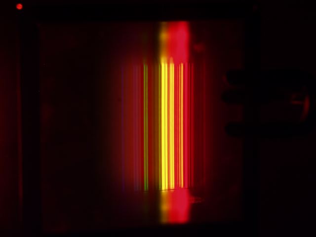 The atomic emission spectrum of neon is shown. Discussion In order to make the faint green and blue lines in the emission spectrum visible, it was necessary to overexpose this image. As a result, light reflected from the walls of the power supply forms a red background for the spectrum you see. The table below lists a few of the lines in the visible spectrum of neon.