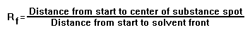 The Rf value for each spot should be calculated. Rf stands for "ratio of fronts", or "retardation factor", and is characteristic for any given compound on the same stationary phase, using the same mobile phase for development of the chromatogram. Hence, known Rf values can be compared to those of unknown substances to aid in their identifications.