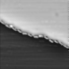 Most chemical reactions not occur in such a controlled environment such as a vacuum chamber. STM can also be used to watch a chemical reaction or physical change occur on a surface under ordinary conditions, room temperature and atmospheric pressure. For example, dissolution of a solid occurs at the solid surface. Put salt in water, and it is the surfaces of the salt crystals that make contact with the water. By obtaining a series of STM images of the same area of a surface exposed to a solvent, it is possible to make a movie and watch dissolution occur. The movie in Figure 7 shows is the dissolution of a crystal of PbS. Note that material is not removed randomly or uniformly from the surface, but is removed preferentially from steps.