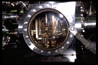 Figure 5. CSTM Vacuum Chamber used by the Hamers Research Group, Department of Chemistry, University of Wisconsin-Madison. Photograph by Jack Markham. Often in STM experiments it is necessary to either maintain a clean surface or control the chemicals that come into contact and react with the surface. Many surfaces will react with the gases in the atmosphere. For example, the surface of aluminum exposed to the air is rapidly covered with an oxide Al2O3. Copper also reacts with oxygen to form copper oxides, such as those responsible for the green color of the Statue of Liberty. While the chemistry of metal oxides such as aluminum is important, it is often the surface of the metal itself that we are interested in. It is possible to obtain an STM image of the pure aluminum metal surface only when the sample is kept in an oxygen free environment.