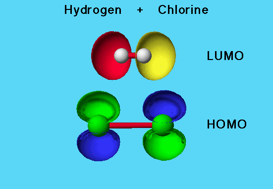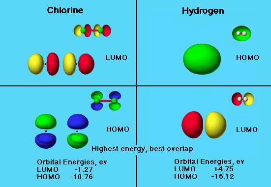 This graphic shows the MO’s with their front surfaces cut away to reveal the position of the ball and stick models for the mechanism proposed. Notice that the LUMO of the hydrogen molecule overlaps constructively with the HOMO of the chlorine molecule.