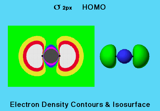 This graphic compares electron density isocontours in the xy plane with the three-dimensional isosurface for the s 2px (sigma bonding) molecular orbital of the nitrogen molecule.