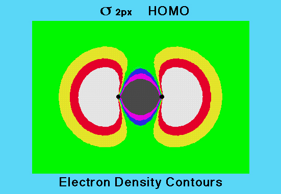 The electron probability density of the molecular orbital may be represented with a two dimensional isocontour map.The isocountour lines (lines along which electron denisty is constant) are between the colored regions in the diagram.