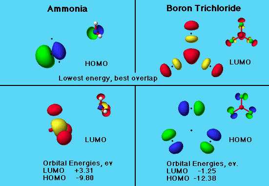 Thus the predicted reaction is a sharing of electrons from the HOMO of the ammonia molecule with the LUMO of boron trichloride. This is a description of a Lewis acid/base reaction. Ammonia, a Lewis base, shares electrons from its HOMO with the LUMO of boron trichloride, a Lewis acid.
