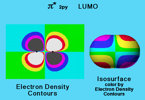 The electron probability density of the π* 2py (pi antibonding) molecular orbital may be represented with a two-dimensional isocontour map. The isocontour lines (lines along which electron density is constant) are between the colored regions in the diagram.