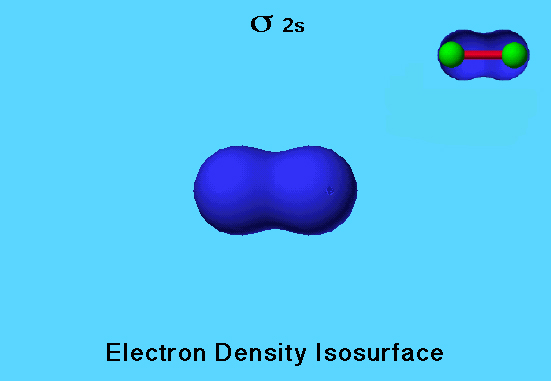 The fluorine molecule has a filled σ 2s (sigma bonding) orbital that is colored blue because on the isocontour surface, all parts of the wave function have the same sign. There are three other bonding orbitals in fluorine that are occupied.