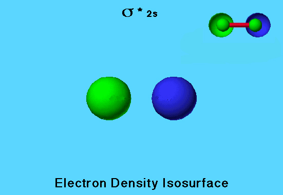 The fluorine molecule has a filled <sigma>* 2s (sigma antibonding) molecular orbital. Because the sign of the wave function for one side of the orbital is opposite to the sign in the other side, one side of the orbital is colored green and the other is colored blue. There are two other antibonding MO’s in fluorine that are occupied, and one that is not occupied.