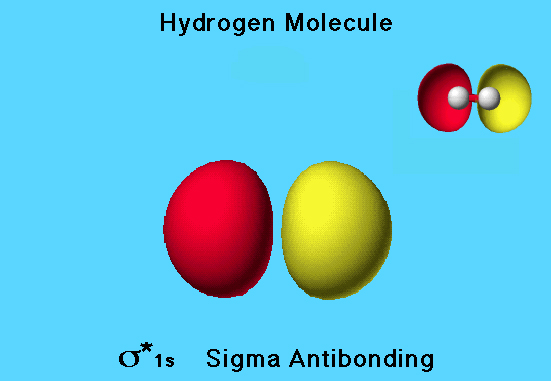 The hydrogen molecule has a σ* 1s (sigma antibonding) molecular orbital that is unoccupied. Because the sign of the wave function for one side of the orbital is opposite to the sign in the other side, one side of the orbital is colored red and the other is colored yellow.