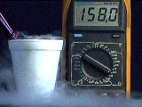 Choke coil cooling A multimeter is set to measure electrical resistance in ohms. The resistance of the choke coil is then measured to be about 150 ohms. Cooling the choke coil in liquid nitrogen reduces the electrical resistance by about a factor of ten. (Companion Demonstration 7.4) |
