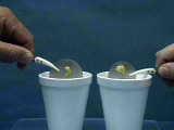 Diamond and Al with pasta Pasta noodles are attached with butter to a diamond disk on the left and an aluminum disk on the right. Hot water is poured into two foam cups. Simultaneously lowering the edges of the two disks into the hot water results in more rapid melting of the butter on the diamond disk. (Companion Demonstration 7.6) |