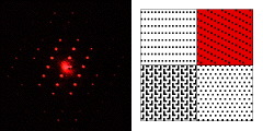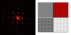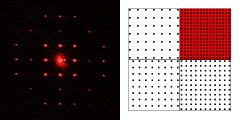 Diffraction centered (increasing wavelength) Diffraction by a centered array. The diffraction pattern shown is produced when the laser passes through the portion of the slide that is highlighted in red. What happens if you put an additional dot in the array in the center of the unit cell? Does it matter if the dot placed in the center is or is not the same size as those in the original array? (Companion Experiment 4) |