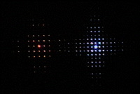 Diffraction square red and blue Diffraction patterns from a square array (see the previous movie) shown using two wavelengths of excitation, red 633-nm light from a He-Ne laser and blue 458-nm light from an argon ion laser; the longer wavelength results in wider spacings between diffraction spots. (Companion Demonstration 4.1) |