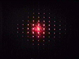 Diffraction non-square Diffraction pattern from a square array (see the previous movie) shown using 458, 476, 488, 496, and 514-nm light from an argon ion laser excitation and red 633-nm light from a He-Ne laser; the longer wavelength results in wider spacings between diffraction spots. (Companion Demonstration 4.1) |