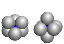 A view of the tetrahedral hole (left) and a view of the octahedral hole (right), constructed with the ICE Solid State Model Kit. (Companion, Figure 5.18A and 5.14A)