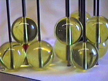 The 4 sizes of spheres in the ICE Solid State Model kit, whose radii reflect ideal packing ratios in many mineral structures. If the clear spheres at the left (1 inch diameter) are packed in the shape of a cube, the green sphere (0.732 inch diameter) fits snugly in the cube's center; if the clear spheres are packed in the shape of an octahedron, the blue sphere (0.414 inch diameter) fits snugly in the octahedron's center; and if the clear spheres are packed in the shape of a tetrahedron, the pink sphere (0.225 inch diameter) fits snugly in the tetrahedron's center. (Companion Figure 5.10)