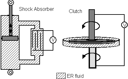 Clutch: changing the voltage, V, the viscosity of the ER fluid can be varied, engaging or disengaging the clutch.
