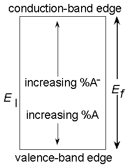 For weak acceptors, as the Fermi level moves torward the valence band edge, a larger fraction is not ionized:A ==> A- + h+ (i.e., by LeChatlier's principle, at high hole concentrations, most of the acceptor is present as A rather than as A-.)