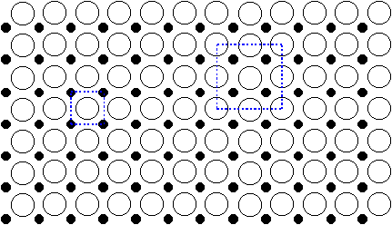 Two possible unit cells for the structure are shown with dashed lines.