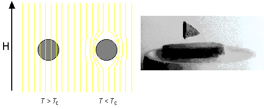 This leads to the phenomenon of levitation, illustrated in the picture to the right, with a magnet levitated above a chilled superconducting pellet.