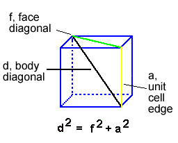 The body diagonal is a part of a right triangle composed of a unit cell edge and a face diagonal. We can calculate the length using the Pythagorean Theorem. The face diagonal is part of a right triangle with two unit cell edges. Thus the body diagonal can be found from three unit cell edges. The body diagonal is four times the atomic radius (d = 4R) so: