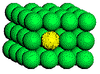 The repeat unit in a metal is an atom or group of atoms. For example, the repeat unit in a pure crystalline metal with a simple cubic structure is one metal atom. In summary, a pure crystalline solid is composed of a regular array of a repeated unit. The repeated unit can be a single atom, a molecule, or a neutral group of positive and negative ions. Click the links on the right to highlight one repeat unit in a pure crystalline metal with a simple cubic structure or to return to the initial structure. |