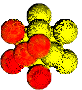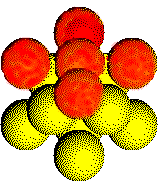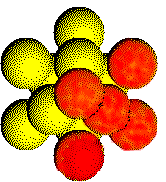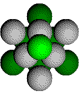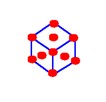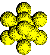 From this angle, a face-centered cubic unit cell is viewed along a body diagonal. Three of the square faces of the unit cell are visible in this view. The links on the right illustrate these topics further. Click the "highlight cube face" link three times to see all three faces. |