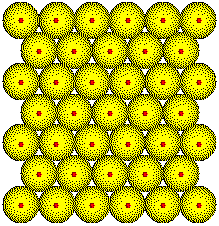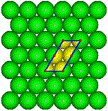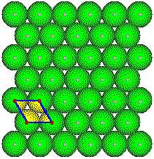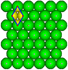 Unit cells with different sizes and shapes can be drawn for any structure. Six cells are shown for this portion of a close-packed plane of metal atoms. Click the link to show the space lattice, and then press the button repeatedly to view the 6 unit cells. Note that the edges of these cells all connect lattice points in the structure, points with the same environments. |