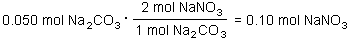 The balanced chemical equation tells us that for every mole of sodium carbonate that reacts, two moles of sodium nitrate are produced. Try again. |