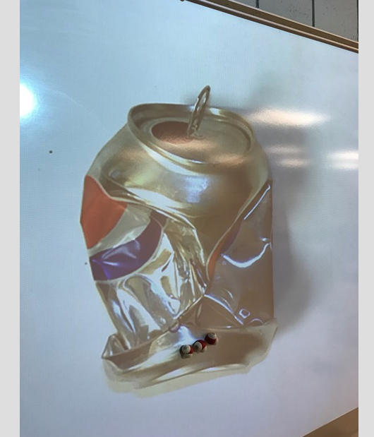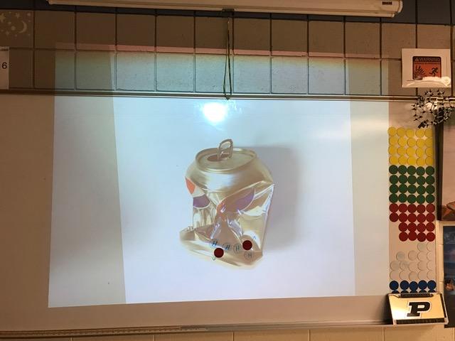 Lastly, I performed the can crush demo for my students. I wanted them to describe what was happening on the particulate level as the little amount of water inside was heating up and then quickly condensing as the can was inverted into the water. By using a desktop camera to simply project the image of the can before and after crushing on a magnetic board without the screen pulled down I asked my students to represent what was happening on a particle level during each part of the demo using magnets, colored markers, water molecule models, or snatoms. I was fascinated that many of the classes included those "trail marks" that they had seen previously in the simulation we had used. Other groups used arrows like I have seen used Modeling Instruction. I have included several pictures representing the activity and some of the representations my students created. I invite you to comment or ask questions below.