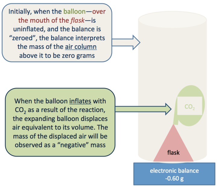 It turns out that the expanding balloon “pushes” air out of the way. And it is the mass of this displaced air—not the CO2(g) that is produced—that accounts for the observed decrease in mass. This can be explained using the concept of buoyancy, which most students5 won’t understand. But they will understand this: when a balance reads “zero”, it takes into account the mass of a column of air—which extends to the top of the atmosphere—pressing on the balance pan. The expanding balloon displaces, or pushes away, an amount of air equivalent to its volume. Assume the balloon is spherical6; measure its radius as best you can and calculate the approximate volume of the balloon—this is the volume of displaced air. Use the density of air7 to show that the mass of the air displaced by the expanding balloon is equal to the loss of mass recorded, to the precision of the measurements.8