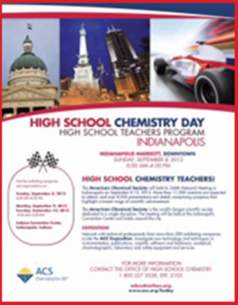 The American Chemical Society is hosting a special High School Chemistry Day for teachers at the ACS Fall National Meeting in Indianapolis, IN, on Sunday, September 8-12, 2013. Presentations will explore new methods of teaching, classroom tools, resources, activities on a range of topics. A special High School/College Interface Luncheon will provide an opportunity to exchange ideas and network. See the ACS High School Chemistry Day Web site for details and/or download the flyer.