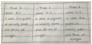 In this formative assessment the students were shown three different trials conducted by the teacher with different amounts of the reactants, baking soda and vinegar, to make observations about. Students were then shown videos explaining how an airbag works in an actual car. The students were then tasked with developing the best airbag by first considering the most important factors, safety, and developing a detailed procedure using the