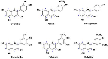 Flowers, fruits and vegetables contain a diverse range of anthocyanins, commonly encountered examples are derived from the set of anthocyanidin aglycones shown in figure 1.5,6 Other aglycones are known, however the structural diversity observed in naturally occurring anthocyanins can also originate from O-glycosyl substituents. Glycosylation can occur at positions 3 and 5,6 although many familiar examples are 3-O-glucosides (some examples are provided in the supporting information document).