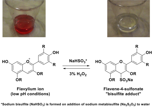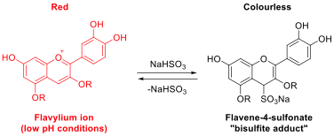 Previous classroom activities have been used to show that anthocyanins extracted from grape juice13 and red cabbage14 are decolourised in the presence bisulfite ions at low pH. This effect is well known in the food industry, this is because the sulfites used to preserve certain fruit products and alcoholic drinks15 are known to react with anthocyanin chromophores16,17 (this process is illustrated in scheme 2). Under acidic conditions, flavylium ions (usually coloured red) derived from anthocyanins are susceptible to nucleophilic attack by bisulfite ions to afford the corresponding flavene-4-sulfonate (frequently referred to as a “bisulfite adduct”).17 the resulting sulfonates are colourless and explain the observed bleaching of wines, juices and other coloured plant-derived material on addition of sulfites or sulfur dioxide.16-18 This reaction is not desirable in red wines and coloured fruit juices, however, it can reduce undesirable “pinking” of white wines.18